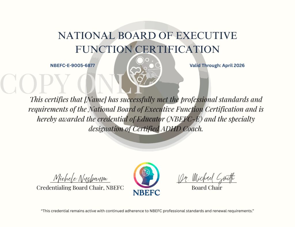 The National Board of Executive Function Certification (NBEFC™) awards professional credentials to qualified individuals who meet education, training, and examination requirements established by the Board. These credentials represent verified competence and integrity in executive function education, coaching, and clinical application.